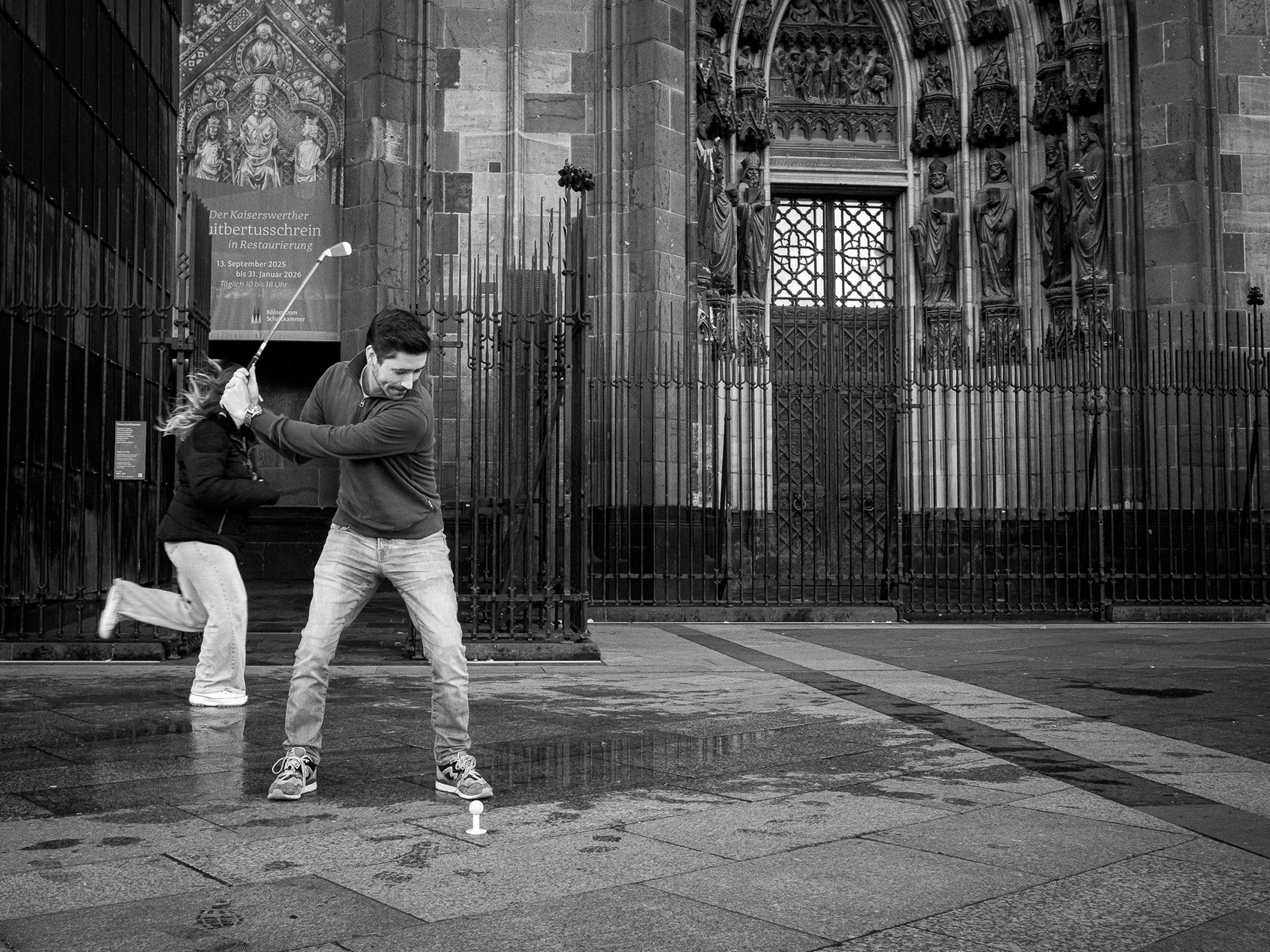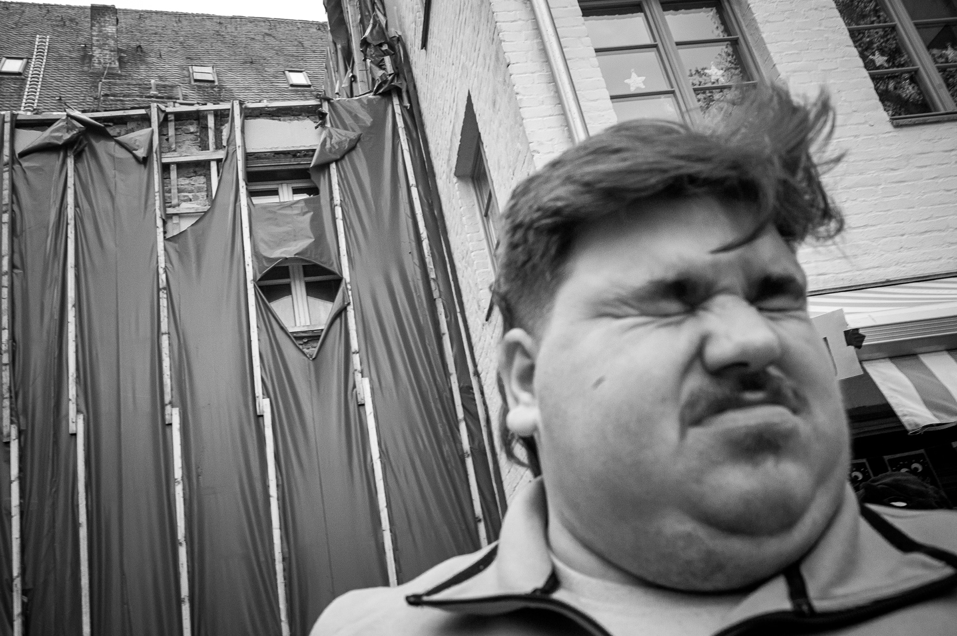 One of my long-term projects is the carnival in Cologne. Traditionally, the carnival season begins every year on November 11. So I spontaneously took a day off and went into town in costume. There I happened to meet my buddy Michael Hampe, and on the spur of the moment we decided to go out and take some photos together. It was a really cool walk, and Damian joined us later, albeit not for long. One of my favorite pictures is this dude, who, in combination with the ripped sheet in the background, constantly brings the word “burst” to mind.